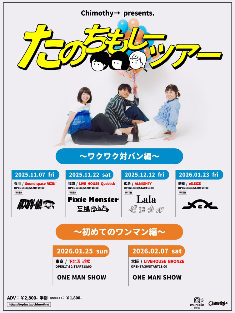 Chimothy→ presents 『たのちもしーツアー』 〜ワクワク対バン編〜 LIVE SCHEDULE 2026/01/23(金) ell.SIZE OPEN 18:30 / START 19:00 2026.01.23 (Fri) 【愛知】📍ell.SIZE OPEN 18:30 / START 19:00 ワクワクなツーマンよろしくお願いします! チケットはこちらから URLをコピーする 報告する