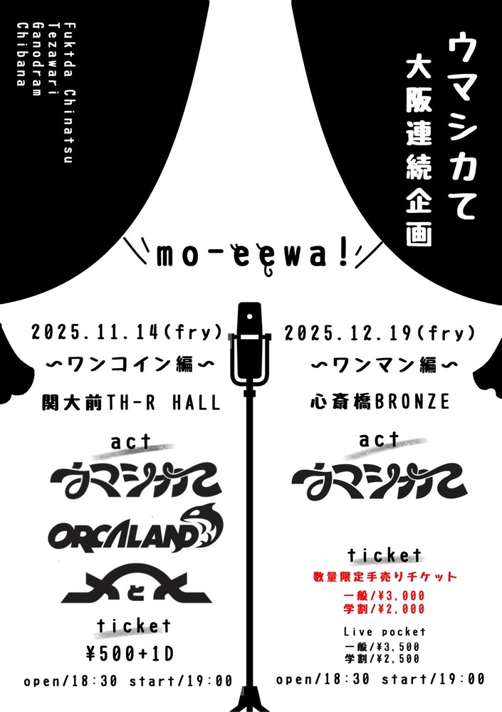 ウマシカて大阪連続企画"mo-eewa!" LIVE SCHEDULE 2025/11/14(金) 関大前TH-R HALL ACT : ウマシカて / ORCALAND チケットはこちらから URLをコピーする 報告する